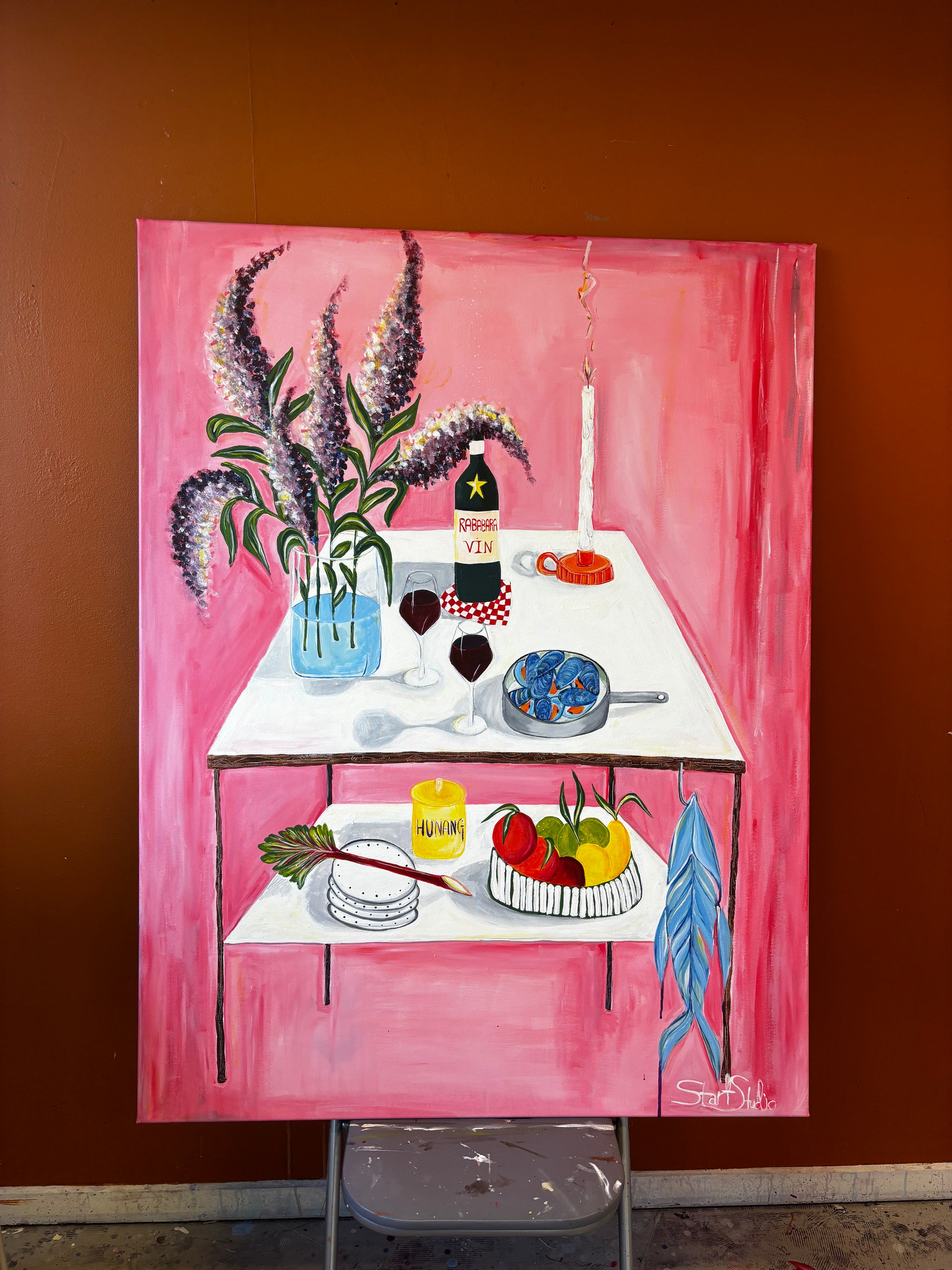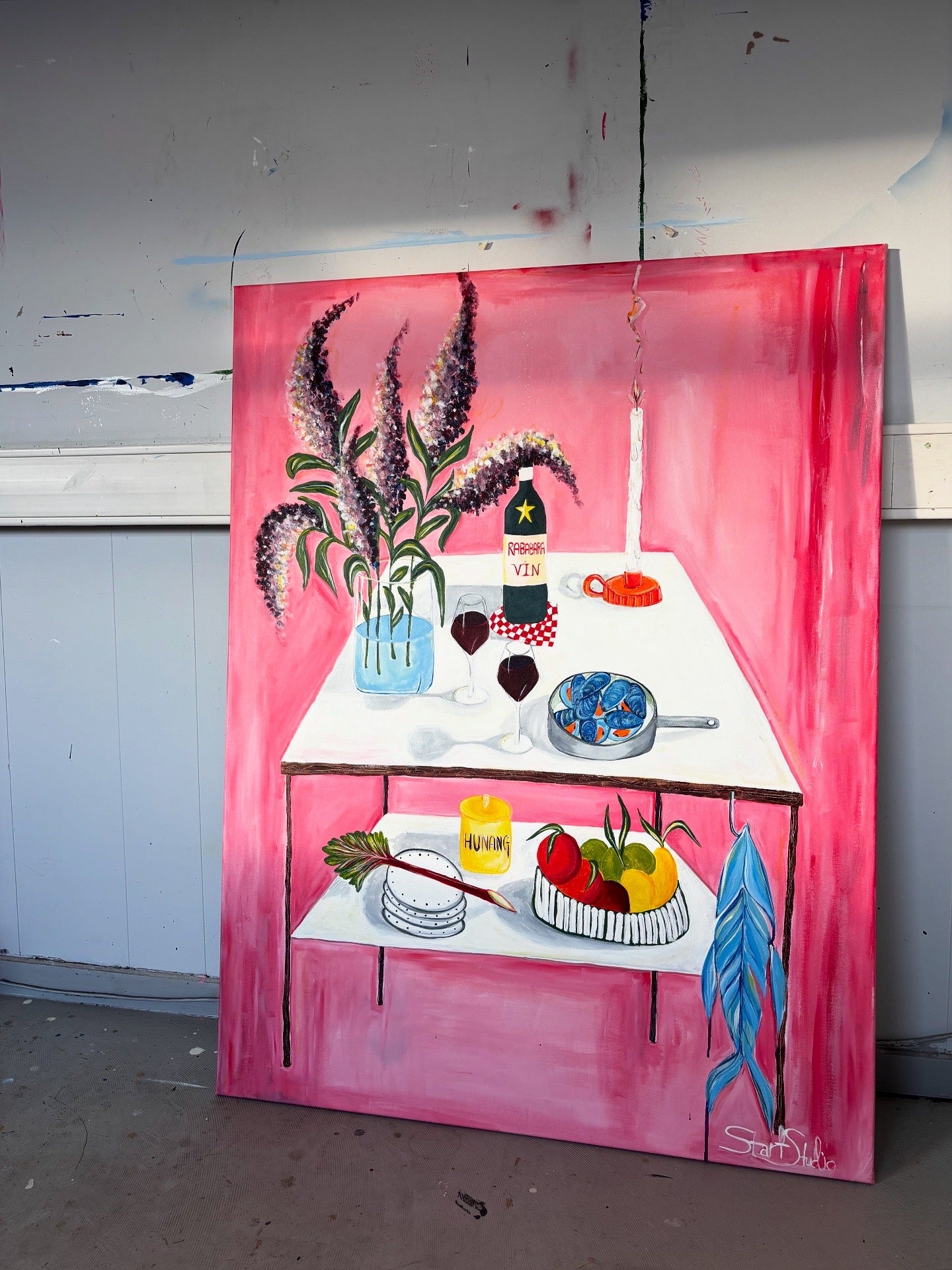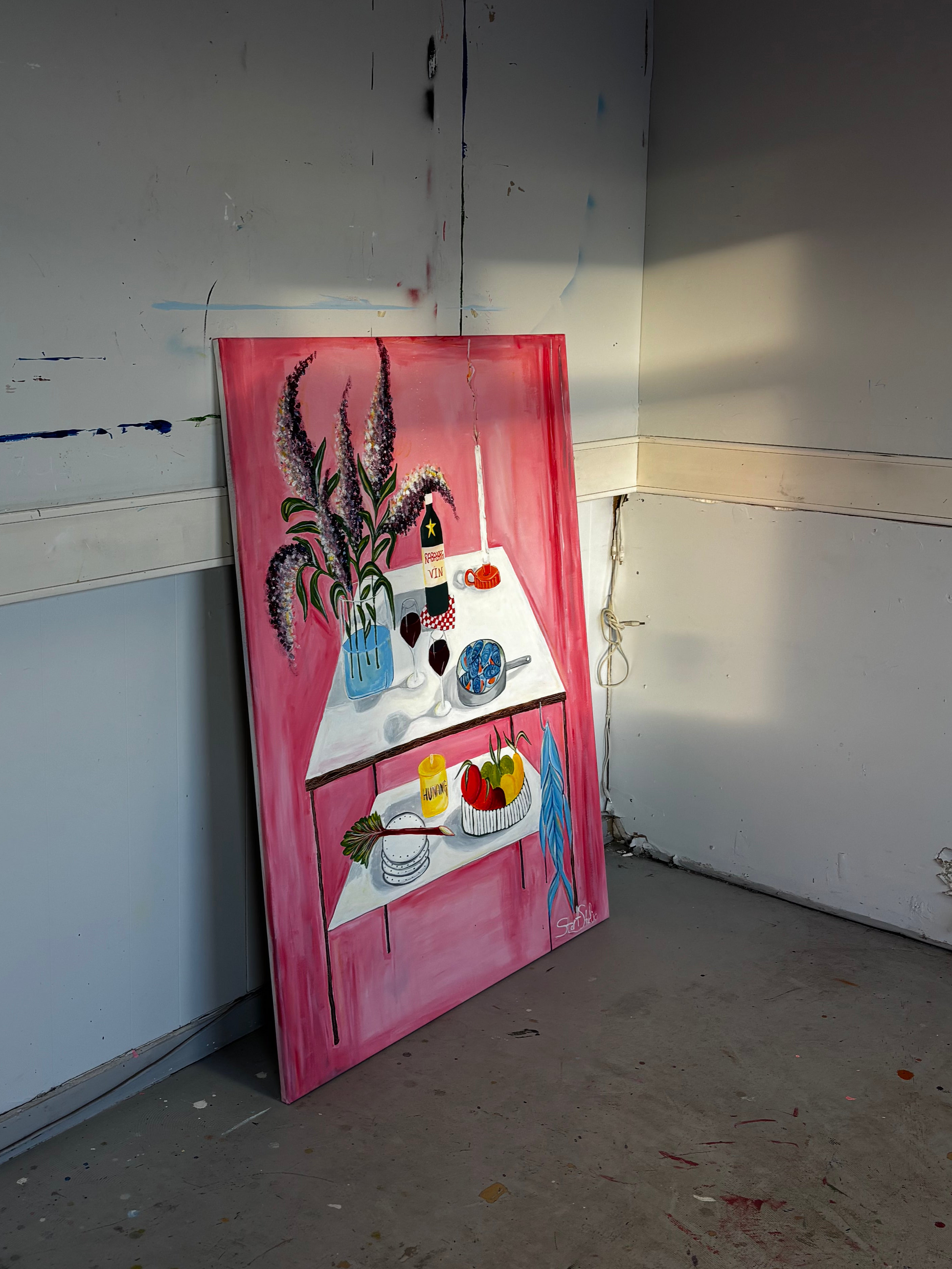This piece was made during summer in Iceland, there is nothing quite like it as the nights stay bright and the sunsets are always beautiful. Rhubarb is one of the sturdy plants that grow in the north and the island is covered in these purple and pink flowers. One of my favourite paintings as it represents everything I love about my home.